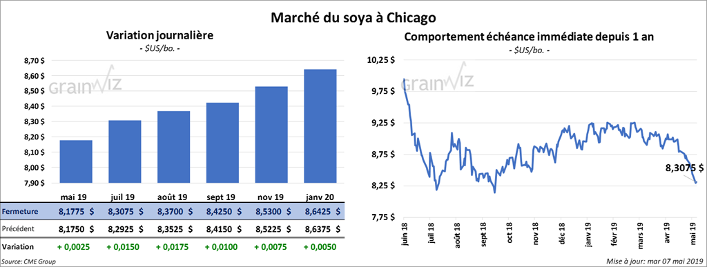 Les contrats de soya US aux échéances les plus rapprochées ont terminé la journée à la hausse d’une fraction de cent. Mais, la plupart des contrats de 2020 ont clôturé en baisse. Les contrats de tourteau ont fini la session dans le rouge de 3,40 $/tonne. Le contrat d’huile mai 19 a clôturé en baisse de 3 points.