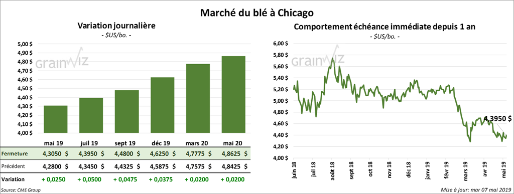 En prévision du rapport mensuel d’offre et de demande, qui sera disponible vendredi, les analystes anticipent une hausse des inventaires de 10 millions de boisseaux pour l’ancienne récolte de blé US à 1,097 milliard de boisseaux. Quant à la nouvelle récolte, la moyenne des prévisions des marchés est de 10,6 milliards de boisseaux. Par ailleurs, dans un sondage de Bloomberg paru aujourd’hui, les analystes prévoient, en moyenne, une production de blé d’hiver US à 1,282 milliard de boisseaux. Pour la première fois cette année, le USDA devrait fournir des données sur la saison 2019/2020.