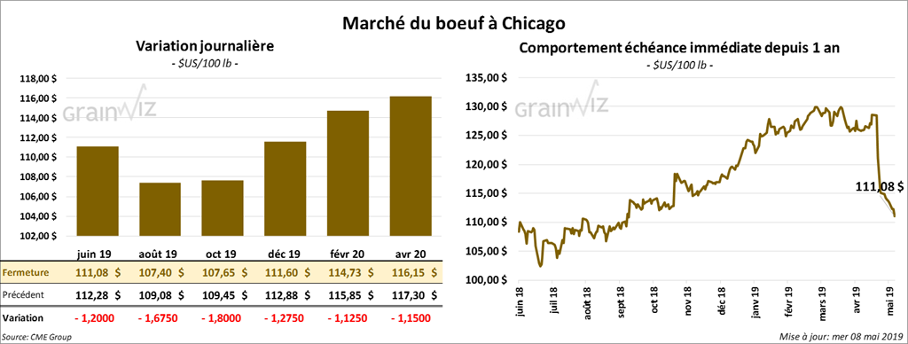 La plupart des contrats de bœuf à Chicago ont terminé la journée avec des pertes de 1,125 $ à 1,80 $. Les intérêts d’ouverture diminus alors que les gros fonds actifs dans le bœuf US essaient de réduire leurs grosses positions acheteuses. Les contrats de veau ont également fini la session en baisse de 1,35 $ à 1,725 $.