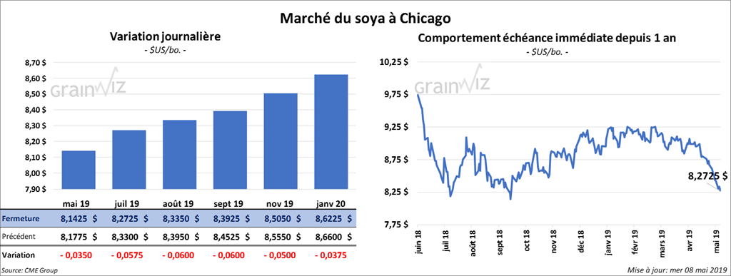 Le USDA va rendre public son rapport mensuel d’offre et de demande vendredi. Un sondage de Reuters montre que les analystes estiment que les inventaires de maïs US de fin d’année 2018/2019 pourraient être en hausse de 20 millions de boisseaux comparativement à avril dernier à 2,055 milliards de boisseaux ce mois-ci. Pour la nouvelle récolte de maïs 2019/2020, le marché prévoit des stocks de 2,131 milliards de boisseaux. Par ailleurs, un sondage de Bloomberg signale que certains analystes prévoient que les inventaires de fin d’année de maïs US pourraient toucher les 2,154 milliards de boisseaux. Aussi, les analystes s’attendent à ce que la production de maïs brésilien augmente de 0,7 million de tonnes à 96,7 millions de tonnes. Pour l’Argentine, ils avancent que la production pourrait augmenter d’un million de tonnes à 48 millions de tonnes.
