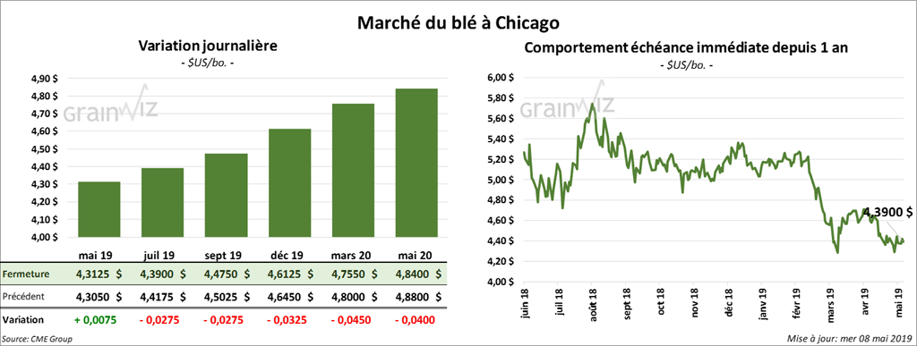 La majorité des contrats de blé US ont terminé la session en baisse d’une fraction à 3 cents. À Chicago, le contrat mai 19 a fait exception en clôturant en hausse. Certains contrats différés ont également fini dans le vert.
