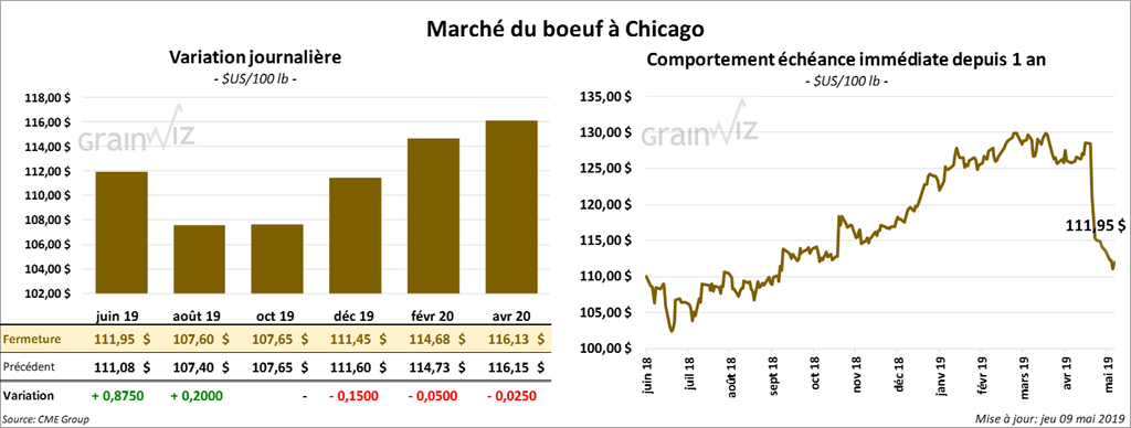 Les contrats de bœuf à Chicago ont terminé la journée sur une note partagée. Pour la première fois depuis les 14 dernières sessions, le contrat juin 19 a fini en hausse. Les contrats de bœuf US aux échéances les plus éloignées ont clôturé dans le rouge. Les contrats de veau ont fini la session en progression de 22,5 à 60 cents.