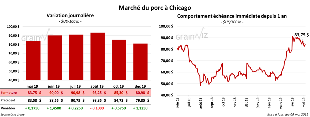 Le 7 mai dernier, le CME Lean Hog Index était en hausse de 5 cents par rapport au jour précédent à 82,68 $. Cet après-midi, la valeur moyenne des découpes a été en progression de 1,88 $ à 86,82 $. Sur une base nationale, le prix moyen au comptant de la carcasse était également à la hausse de 9 cents à 79,74 $.