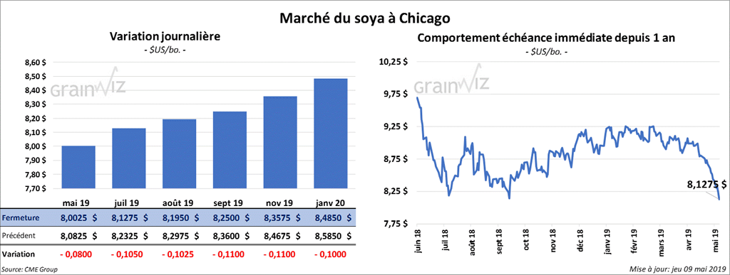 Face aux inquiétudes concernant les négociations commerciales Chine/USA, les contrats de soya US aux échéances les plus rapprochées ont clôturé en baisse de 13 à 14 ½ cents.