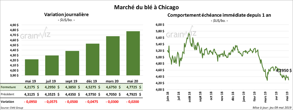 Durant l’avant-midi, le USDA a rapporté qu'au cours de la semaine du 2 mai dernier, les ventes à l’exportation de blé US 2018/2019 n’ont été que de 90,574 tonnes. C’est le résultat le plus faible de l’année commerciale, mais il reste que de nombreuses ventes doivent être expédiées avant le 1er juin prochain. Les ventes à l’exportation de blé US 2019/2020 ont été les plus élevées de l’année commerciale à 412,288 tonnes.