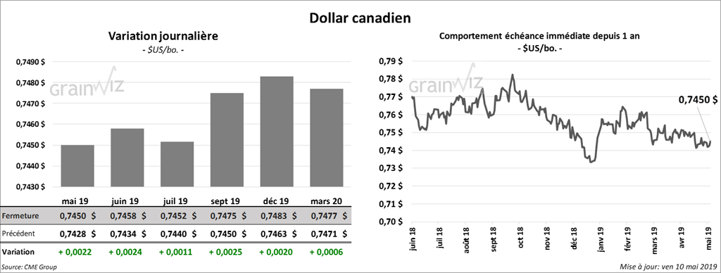 Mondialement, les inventaires de fin d’année de blé ont baissé de 0,63 million de tonnes à 274,98 millions de tonnes pour la saison 2018/2019. Pour sa première estimation de la saison 2019/2020, et sur une base annuelle, le USDA estime les stocks mondiaux de blé à la hausse de 18,03 millions de tonnes à 293,01 millions de tonnes. Il y aurait une augmentation de la production de blé canadien, australien et russe (qui est toujours en dessous des évaluations privées à 77 millions de tonnes). À noter qu’une bonne partie de ces résultats ont déjà été intégrés par les marchés.