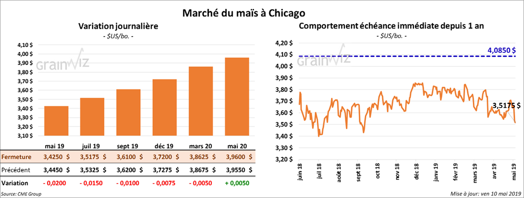 La majorité des contrats de maïs US aux échéances les plus rapprochées ont terminé la session au neutre à baissier de 2 cents. Quelques contrats de 2020 ont clôturé en hausse. Pour la semaine, le contrat juillet 19 a perdu 5,12 %.