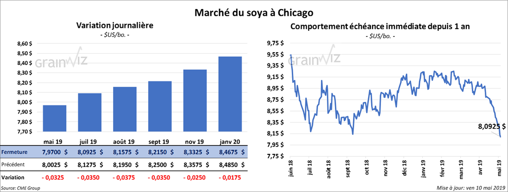 Les contrats de soya US aux échéances les plus rapprochées ont terminé la journée en baisse de 1 à 3 ½ cents. Pour la semaine, le contrat juillet 19 a reculé de 3,92 %. Les contrats de tourteau ont clôturé dans le rouge de 1,20 $/tonne. Le contrat d’huile mai 19 a fini en hausse de 16 points.