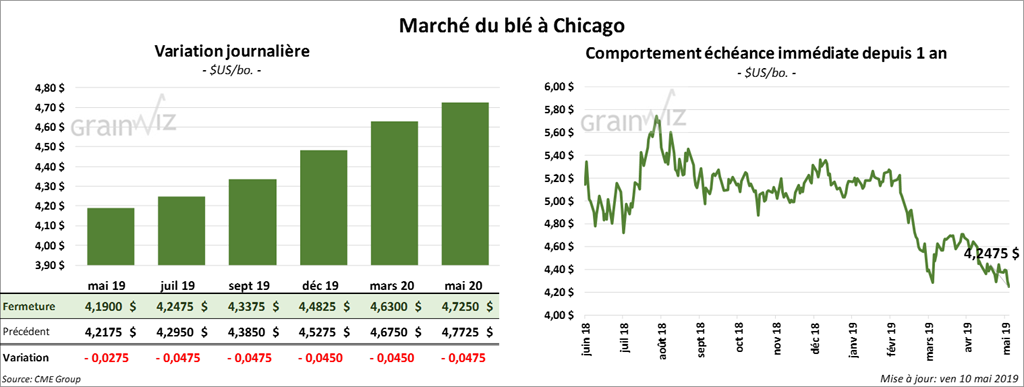 À Kansas, la plupart des contrats de blé ont fini la journée dans le rouge de 6 à 10 ¾ cents. Pour la semaine, le contrat juillet 19 a reculé de 3,61 %. À Chicago, les contrats étaient en baisse de 2 à 5 cents. Pour la semaine, le contrat juillet 19 a perdu 3,03 %. À Minneapolis, les majorité des contrats ont terminé la journée sur une note partagée.