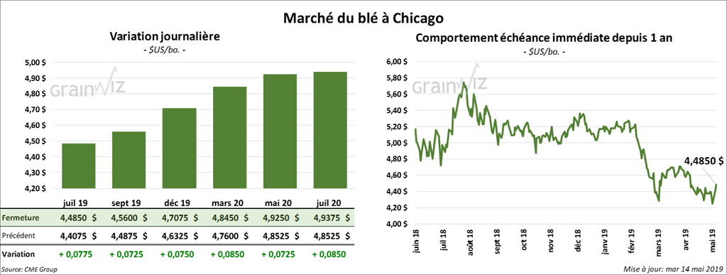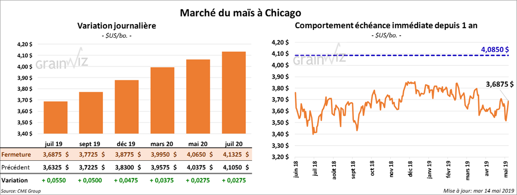 Les contrats de maïs US 2019 ont terminé la journée avec des gains à deux chiffres. Ceux différés ont également clôturé en hausse de 4 à 10 cents. Le contrat mai 19 a expiré aujourd’hui à 3,60 ½. Les ensemencements très lents et les couvertures de positions nettes vendeuses expliquent la hausse.