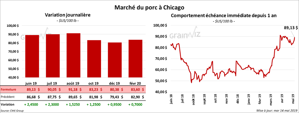 Le 10 mai dernier, le CME Lean Hog Index était en hausse de 24 cents par rapport au jour précédent à 83,04 $. Cet après-midi, la valeur moyenne des découpes a été en progression de 40 cents à 88,64 $. Sur une base nationale, la prix moyen au comptant de la carcasse était en hausse de 1,14 $ à 82,02 $.