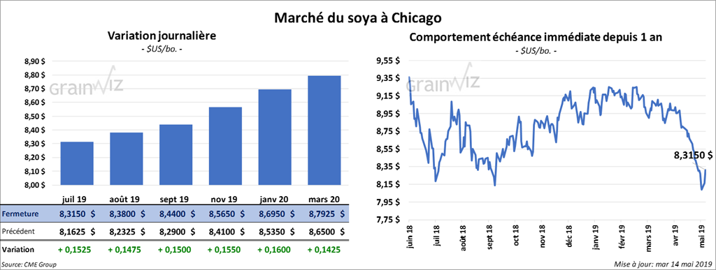 La plupart des contrats de soya à Chicago ont fini la session avec des gains de 26 à 29 cents. Les spéculateurs et les gestionnaires fonds ont commencé à couvrir leurs positions nettes vendeuses records après que le USDA ait signalé la lenteur des ensemencements de soya US. Le contrat de tourteau juillet 19 a terminé la session en hausse de 10,70 $/tonne. L’huile a gagné 39 points. Les contrats mai 19 ont expiré aujourd’hui.