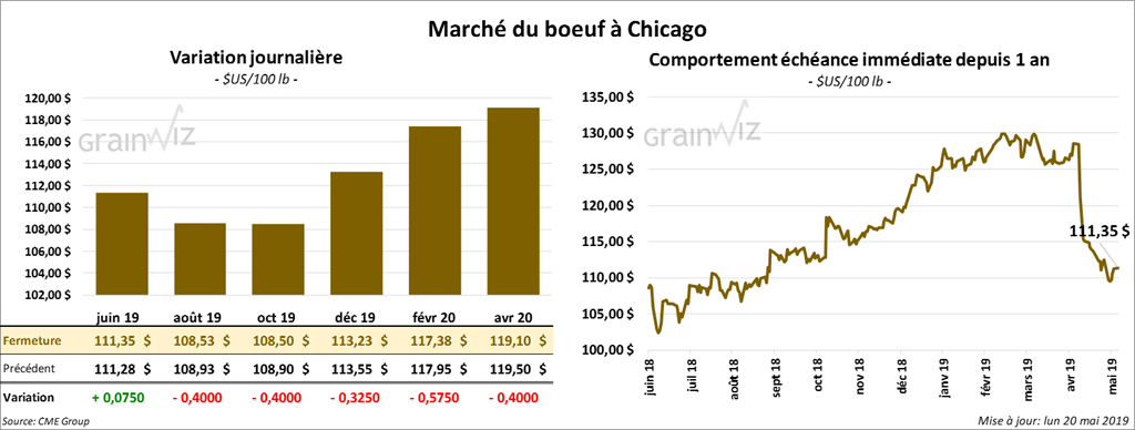 La plupart des contrats de bœuf à Chicago ont terminé la session en baisse. Le contrat juin 19 a tout de même fini en hausse de quelques cents. Les contrats de veau US ont fini la journée en recul de 32,5 à 82,5 cents. La faiblesse des contrats de bœuf et la hausse du prix du maïs ont pesé sur le secteur.