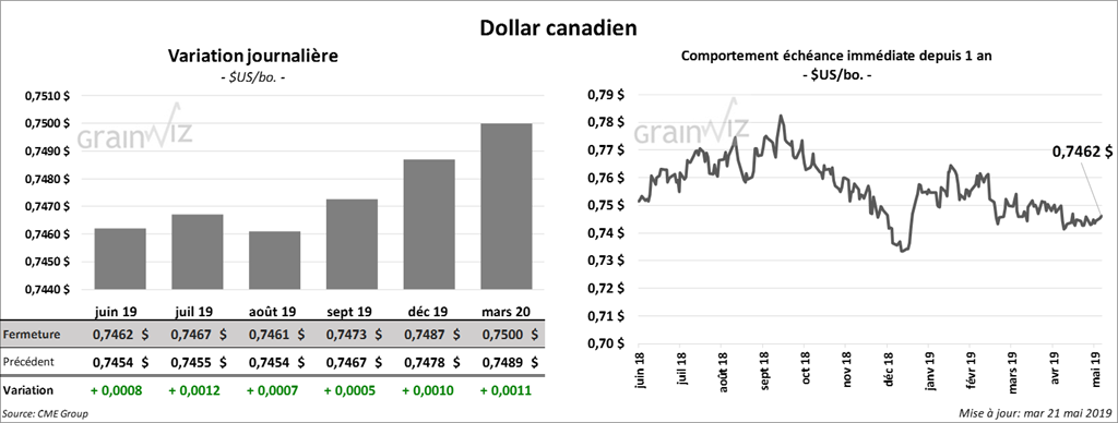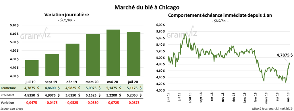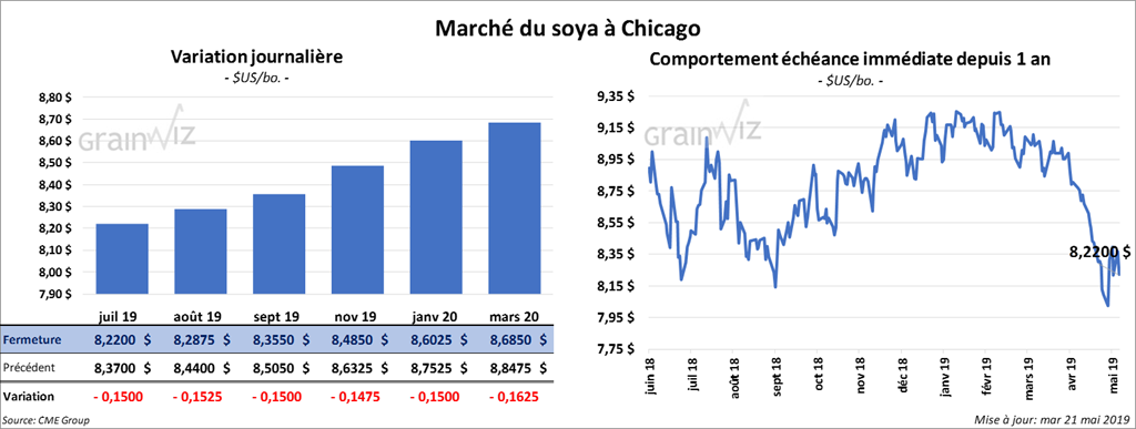 Après avoir été dans le vert durant la matinée, les contrats de soya à Chicago ont clôturé en baisse de 9 à 9 ¾ cents. Quant au tourteau, le contrat juillet 19 a fini en recul de 2 $/tonne. L’huile a également perdu 36 points.
