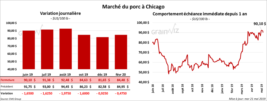 Les contrats de bœuf à Chicago ont terminé en baisse de 20 à 50 cents. Les contrats de veau ont également reculé de 1,30 $ à 1,775 $. Le contrat mai 19, qui devrait expirer jeudi, a clôturé en hausse de 22,5 cents.