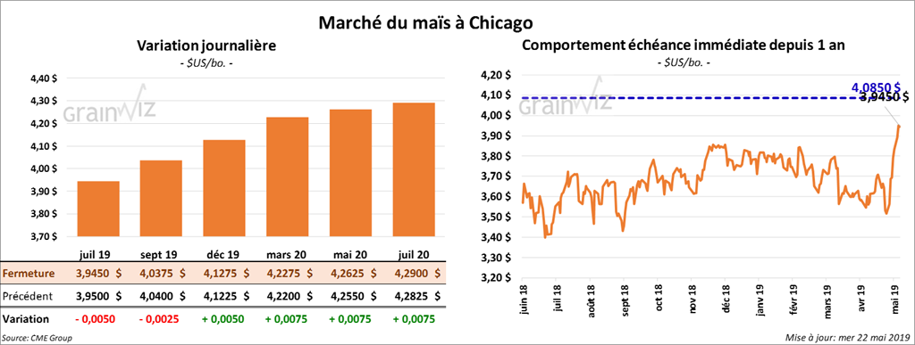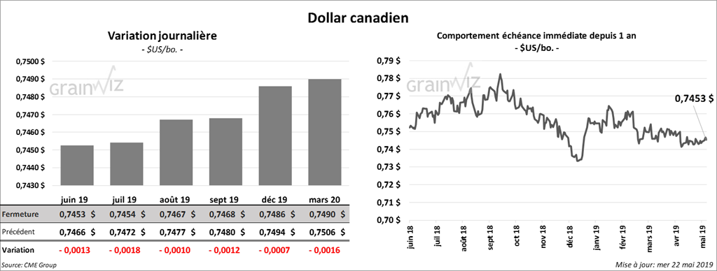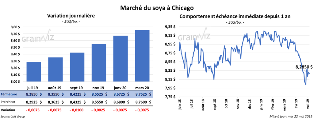 Les contrats de soya US ont rebondi après avoir fini à la baisse hier. Les contrats aux échéances les plus rapprochées ont donc terminé en hausse de 6 à 7 cents. Le contrat de tourteau juillet 19 a également clôturé en progression de 3 $/tonne. L’huile a gagné 17 points.