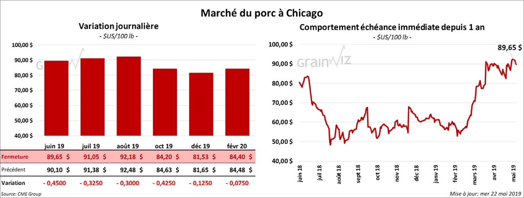 Les contrats de porc à Chicago ont terminé la session en baisse de 12,5 à 45 cents.