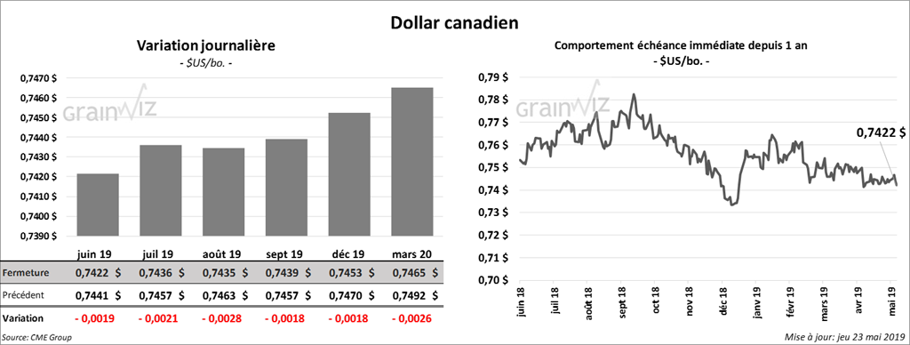 La majorité des contrats de soya US aux échéances les plus rapprochées ont terminé la journée en baisse de 7 à 7 ¼ cents. Le contrat de tourteau juillet 19 a fini la session dans le rouge de 1,10 $/tonne et l’huile a également reculé de 53 points.