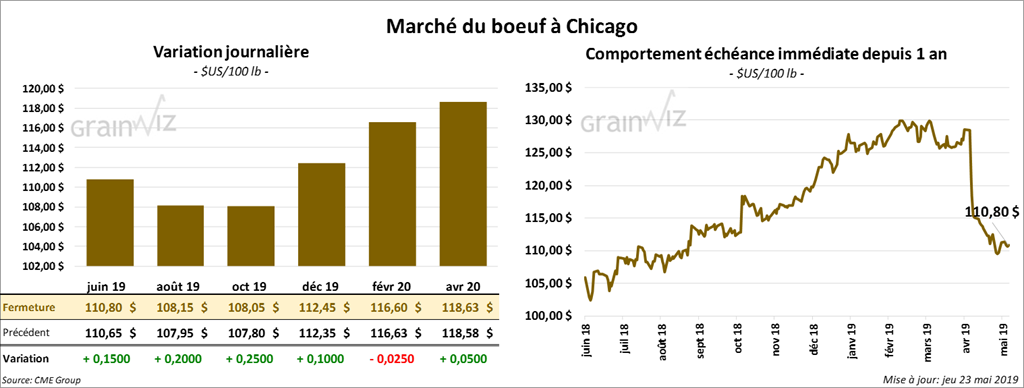 La plupart des contrats de bœuf à Chicago ont terminé la session en hausse de 5 à 25 cents. Par contre, le contrat février 2020 a fini en baisse d’une coche. Les contrats de veau ont clôturé au neutre à haussier de 42,5 cents. Le contrat mai 19 a expiré à 135,60 $.
