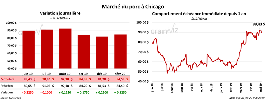 Les contrats de porc US aux échéances les plus rapprochées ont terminé la session en baisse de 10 à 22,5 cents. Les contrats différés ont clôturé en hausse.