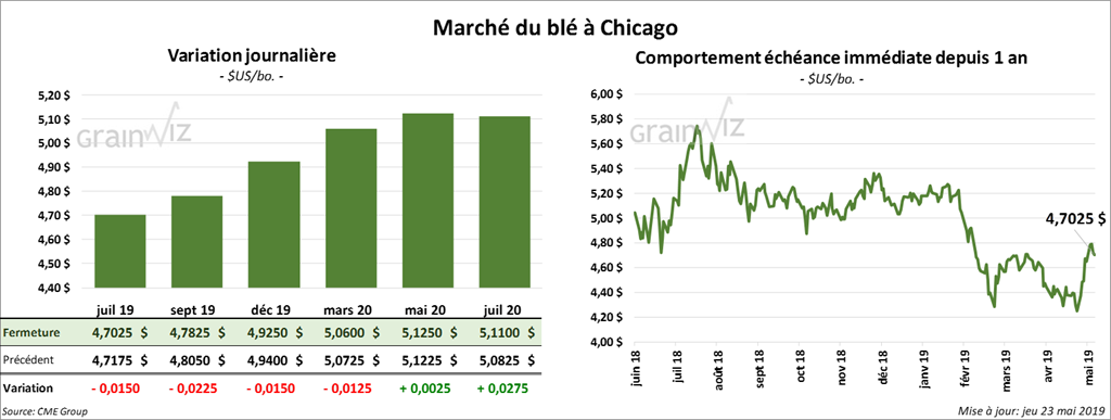 À Minneapolis, les contrats de blé US ont fini la session en baisse de 7 à 9 ½ cents. À Kansas, le recul a été de 1 à 7 cents. À Chicago, les contrats ont baissé de 1 à 2 ½ cents.