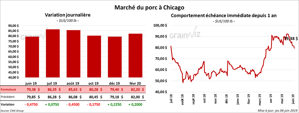 Le 4 juin dernier, le CME Lean Hog Index était en baisse de 23 cents par rapport au jour précédent à 80,67 $. Cet après-midi la valeur moyenne des découpes a gagné 18 cents à 83,25 $. Sur une base nationale, le prix moyen au comptant de la carcasse a été en recul de 73 cents à 75,63 $.