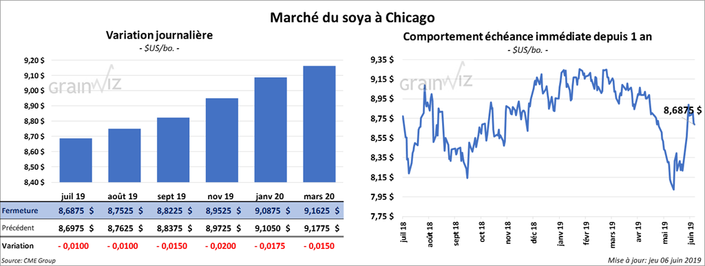La majorité des contrats de soya US ont terminé la session en baisse de 1 à 2 cents. Quant au tourteau, il a reculé de 1,80 $/tonne. L’huile a fait l’inverse en prenant 54 points.
