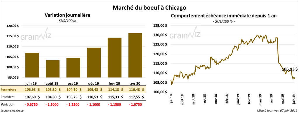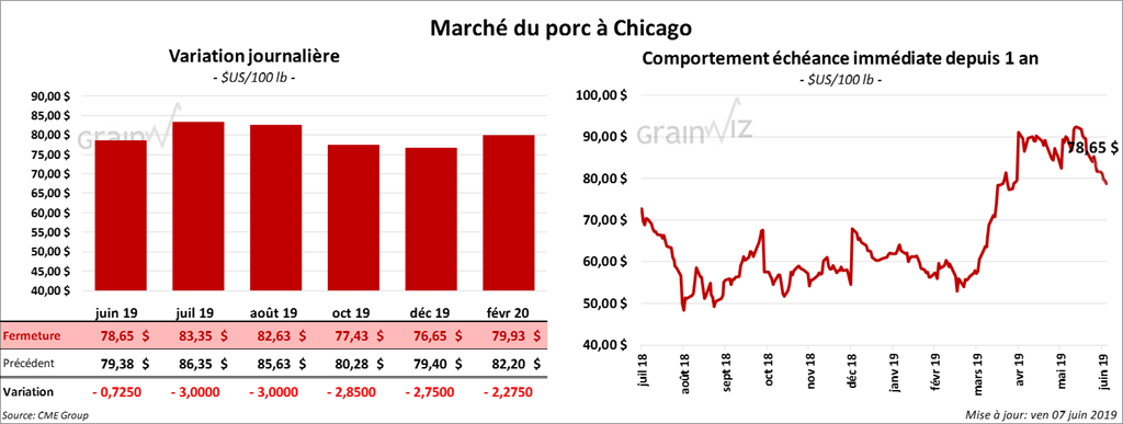 Les contrats de porc US aux échéances les plus rapprochées ont clôturé en baisse de 72 cents. Les contrats juillet 19 et août 19 ont fini à leurs limites à la baisse.