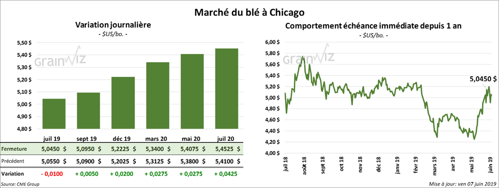 Les contrats de blé à Chicago ont fini en baisse de 2 ½ à 5 ½ cents. À Minneapolis, ils ont également terminé en recul de 1 ¾ à 3 ¾ cents. À Kansas, les contrats de blé dur rouge d’hiver ont perdu entre 4 ¾ et 6 ½ cents. Le «spread» Chicago-Kansas a terminé à un record prime de 55 ½ cents. La valeur de transformation du blé dur rouge d’hiver peut être supérieure à celle du blé tendre rouge d’hiver dans des circonstances normales, mais actuellement ce n’est pas le cas. À Kansas, le taux de protéines présent dans le blé sera probablement en baisse à cause d’une année de forte production dans des conditions trop humides. En outre, le ratio stocks/usage entre les deux classes présente un déséquilibre majeur. Il ne s’agit pas de plaider en faveur de l’élargissement du «spread», mais il existe un axiome qui stipule que «les marchés peuvent demeurer illogiques plus longtemps que vous ne pouvez rester solvable».