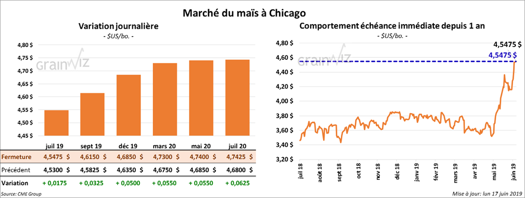Ce matin, le USDA a annoncé des inspections à l’exportation de seulement 653,875 tonnes de maïs US durant la semaine du 13 juin dernier. Il s’agit d’une baisse de 23,24 % par rapport à la semaine précédente et de 1 million de tonnes comparativement à la même période en 2018.