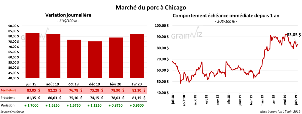 Les contrats de porc US aux échéances les plus rapprochées ont fini la journée avec des gains de 1,125 $ à 1,70 $.