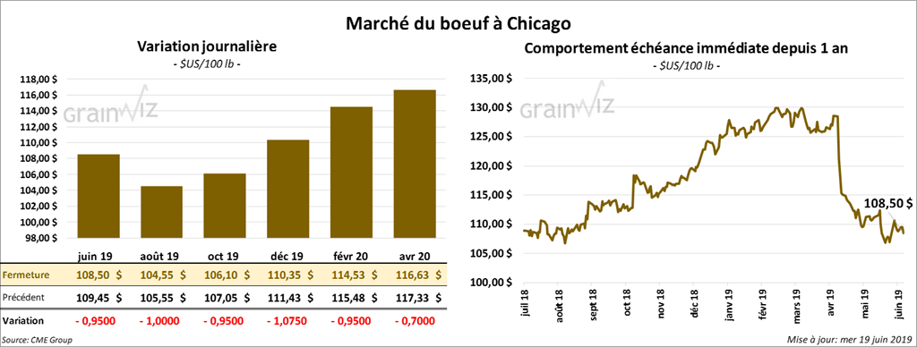 Les contrats de bœuf à Chicago ont clôturé dans le rouge de 70 cents à 1,075 $. Les contrats de veau aux échéances les plus rapprochées ont aussi fini la session en baisse de15 à 72,5 cents. Toutefois, ceux différés ont terminé en hausse.