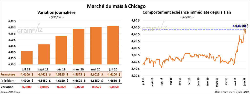 Les contrats de maïs US aux échéances les plus rapprochées ont terminé la journée en baisse de 8 à 9 ¾ cents. Les prises de profits et la baisse de 2,3 % observée dans les contrats d’éthanol ont exercé des pressions sur le secteur. À Kansas, le «spread» blé/maïs était à 16 ½ cents alors que la faiblesse des prix du blé a aussi pesée sur le marché.