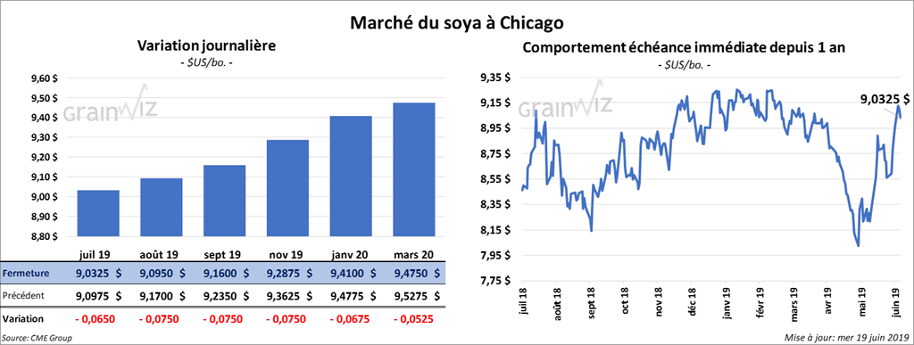 Après 7ème sessions consécutives à la hausse, les contrats de soya US ont fini la session en baisse de 10 à 11 ½ cents. Les contrats de tourteau ont également clôturé dans le rouge de 5,10 $/tonne. L’huile a fait l’inverse en gagnant 4 points.