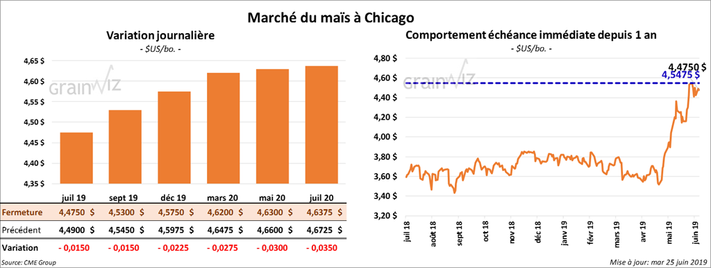 Après la fermeture hier, le USDA a rapporté que dimanche dernier, 96 % des ensemencements de maïs US ont été complétés. Par ailleurs, 89 % des plants ont émergé comparativement à une moyenne des dernières années de 99 %. À ce moment-ci de la saison, 5 % des semis sont au stade de la soie.