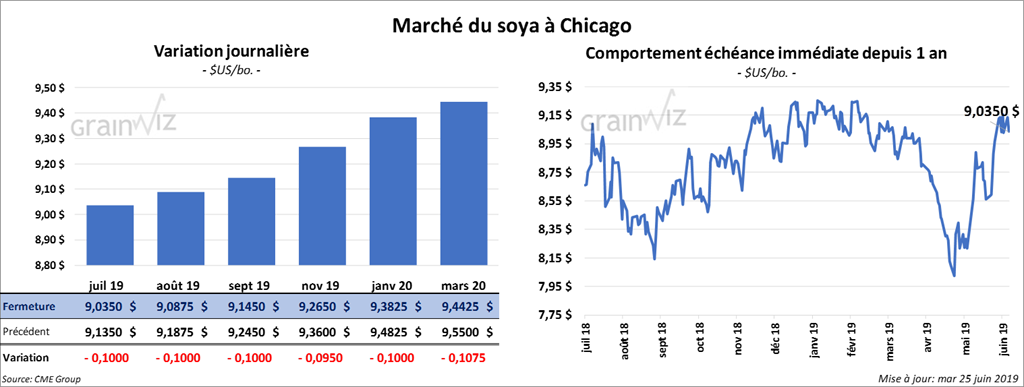 La plupart des contrats de soya à Chicago ont terminé la journée en baisse de 5 à 8 cents. Les contrats de tourteau ont suivi la même direction en perdant 1,90 $/tonne. L’huile a recul de 35 points.