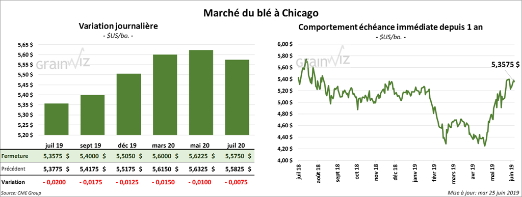 Le USDA estime que dimanche dernier, les conditions de culture du blé d’hiver US et celles de blé de printemps US ont décliné de 77 % à 75 % dans les catégories «bon à excellent». Au Kansas, la baisse a été de 5 points et en Oklahoma de 12 points. Dans le cas du blé de printemps, les seuls endroits où il y a une amélioration sont le Dakota du Sud et l’État de Washington. La maturation des semis est toujours en retard. Dans le cas du blé d’hiver US, 94 % sont en épiaison alors que la moyenne des dernières années est de 99 %. Dans le cas du blé de printemps, 7 % est en épiaison contre 29 % pour la moyenne des dernières années. La récolte du blé d’hiver est terminée à 15 % comparativement à une moyenne des dernières années de 34 %. Au Kansas, les travaux sont terminés à seulement 5 %. En Oklahoma, la récolte est complétée à 43 % et au Texas à 58 %. Cette semaine, les prévisions plus sèches pour le sud des Plaines devraient permettre une meilleure progression de la récolte.
