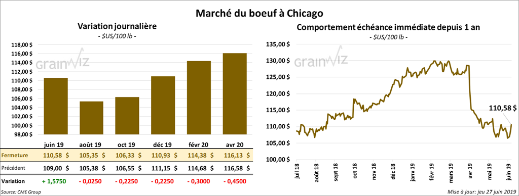La majorité des contrats de bœuf à Chicago ont terminé la journée en recul d’une cent à 45 cents. Le contrat juin 19, qui expirera bientôt, a clôturé en hausse de 1,575 $. Les contrats de veau ont fini en baisse de 2,5 à 75 cents.
