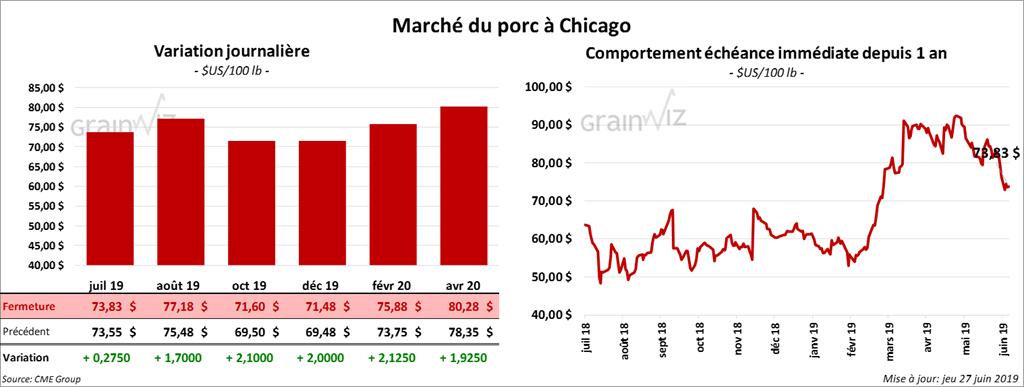 Le 25 juin dernier, le CME Lean Hog index était en baisse de 40 cents par rapport au jour précédent à 77,91 $. Cet après-midi, la valeur moyenne des découpes a été en progression de 22 cents à 74,19 $. Sur une base nationale, le prix moyen au comptant de la carcasse était en baisse de 1,56 $ à 69,14 $.