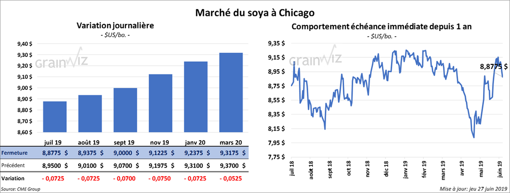 La plupart des contrats de soya à Chicago ont terminé en baisse de 5 à 6 ½ cents. Les contrats de tourteau ont également fini dans le rouge de 1,20 $/tonne. L’huile est demeurée au neutre.