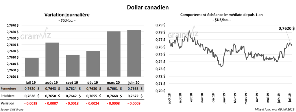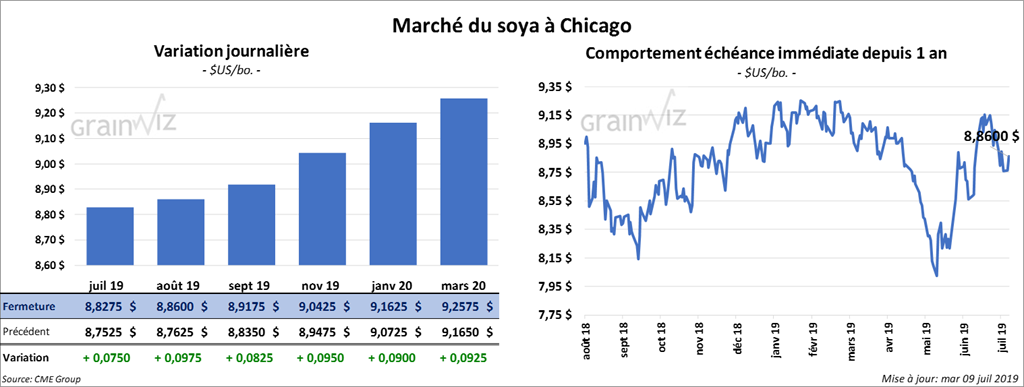 Jeudi, le USDA devrait présenter son rapport mensuel d’offre et de demande pour le mois de juillet. Les analystes s’attendent à des inventaires de fin d’année de soya US 2018/2019 en baisse de 14 millions de boisseaux à 1,056 milliard de boisseaux. Pour la nouvelle saison 2019/2020, les inventaires pourraient baisser de 215 millions de boisseaux à 830 millions de boisseaux.