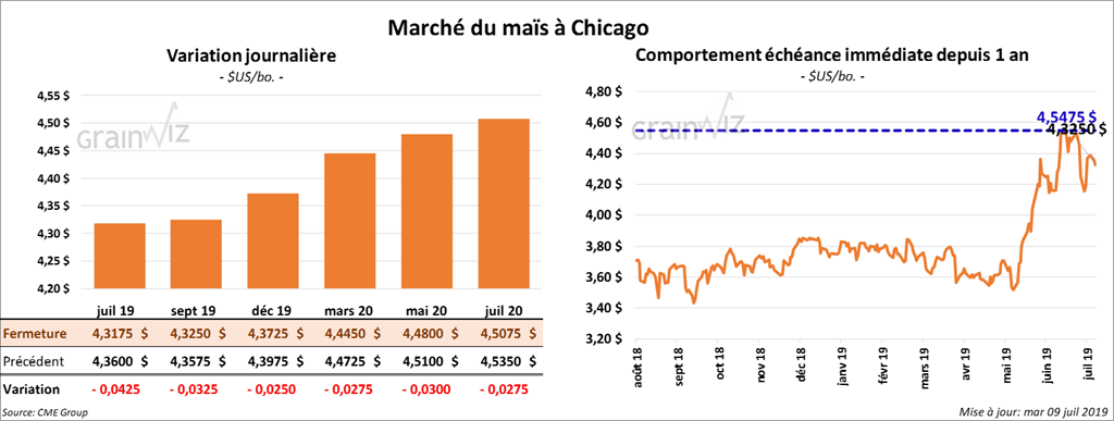 Les contrats de maïs US 2019 ont terminé la session en baisse de 6 à 7 cents. Quelques contrats 2020 ont aussi clôturé dans le rouge d’un centime.