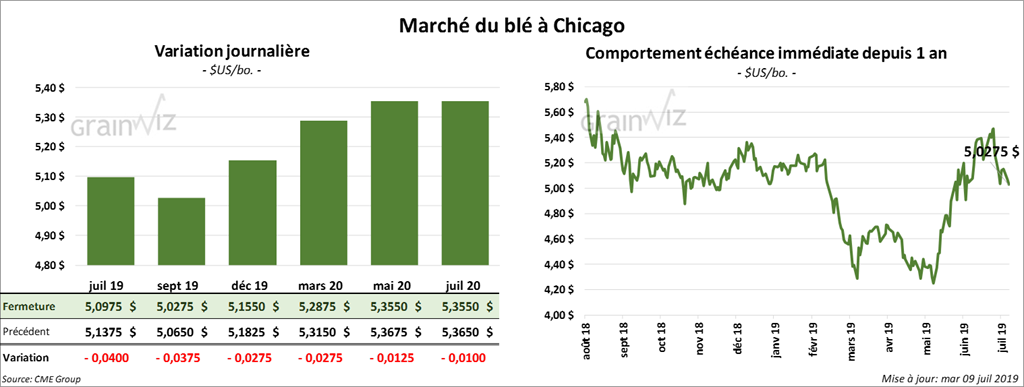 Les contrats de blé US ont terminé la journée en baisse de 1 ½ à 8 ¼ cents. À Kansas, ceux de blé dur rouge d’hiver US étaient en hausse.