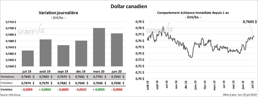 Les contrats de soya US aux échéances les plus rapprochées ont fini la journée avec des pertes de 10 à 11 ½ cents. Le contrat de tourteau août 19 a aussi reculé de 3,20 $/tonne. L’huile a perdu 3 points.