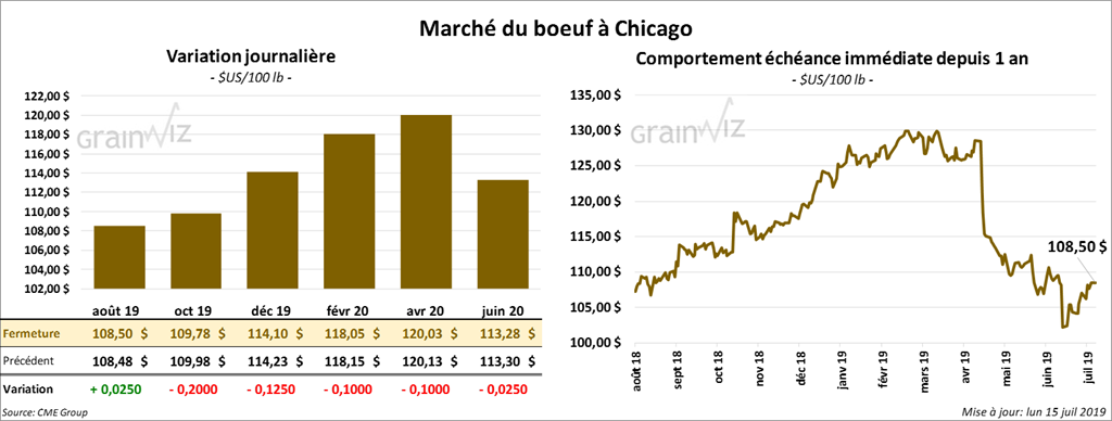 Les contrats de bœuf à Chicago ont fini la session sur une note partagée, mais le contrat août 19 a clôturé légèrement à la hausse. Les contrats de veau aux échéances les plus rapprochées ont terminé dans le vert de 5 à 12,5 cents.