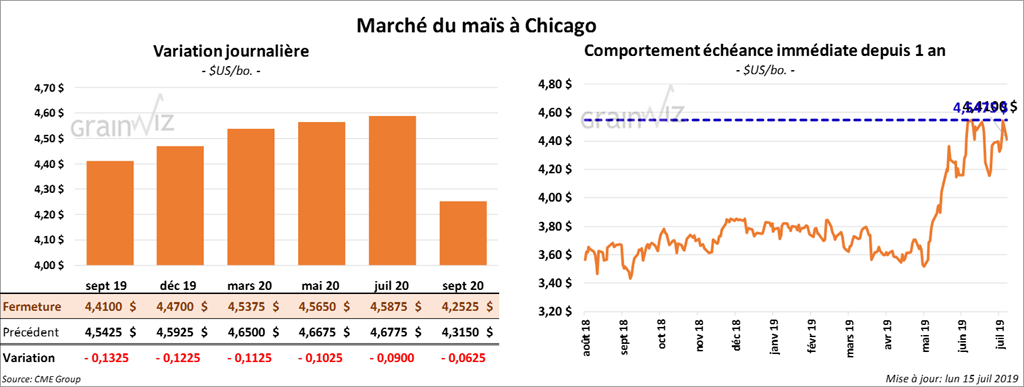La majorité des contrats de maïs US aux échéances les plus rapprochées ont terminé la session en baisse de 10 à 13 ¼ cents.