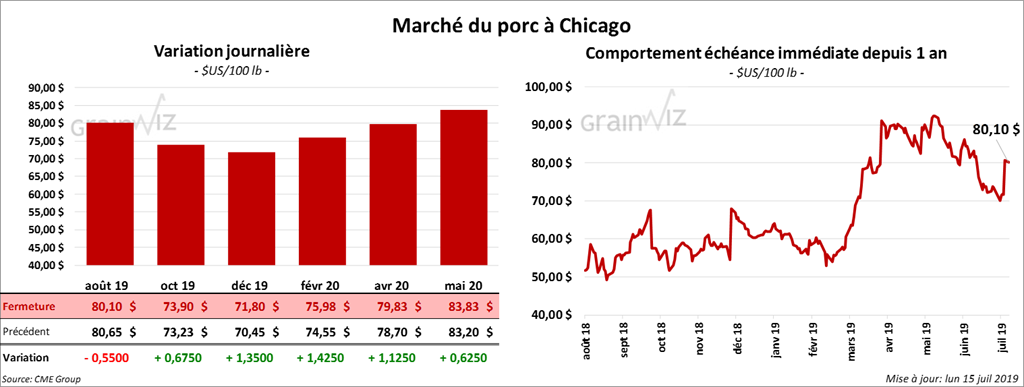 À la fermeture du marché de Chicago, les contrats de porc étaient en progression partagée. Le contrat juillet 19 a expiré à 70,775 $ et les contrats différés ont terminé la journée en hausse.