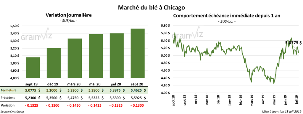 Les contrats de blé US ont clôturé en baisse aux 3 places de marché entre 10 et 18 ¼ cents.