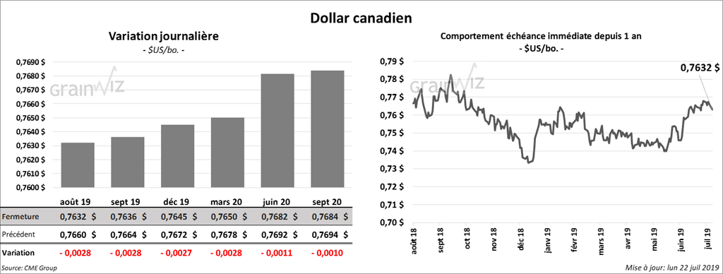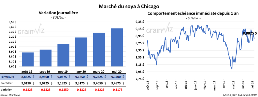 La majorité des contrats de soya US aux échéances les plus rapprochées ont terminé la journée dans le rouge de 13 à 13 ½ cents. Le contrat de tourteau août 19 a fini la session en baisse de 2,80 $/tonne. L’huile a reculé de 37 points.
