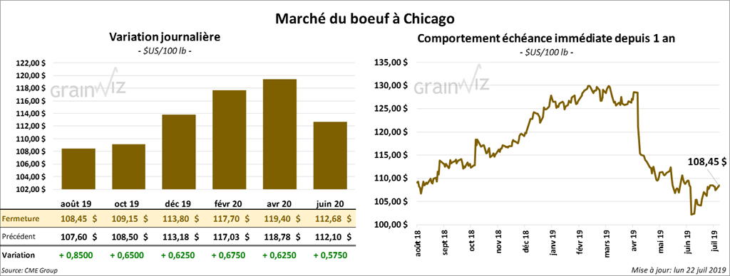 Présenté dans la même journée, le rapport Cattle-on-Feed indique qu’au 1er juillet dernier, les stocks des parcs d’engraissement étaient en hausse de 1,75 % par rapport à l’an passé à 11,485 millions de têtes. Quant aux placements au cours du mois de juin dernier, ils ont été en baisse de 2,34 % à 1,756 millions de têtes. La commercialisation a également reculé de 3,04 % à 1,945 million de têtes.